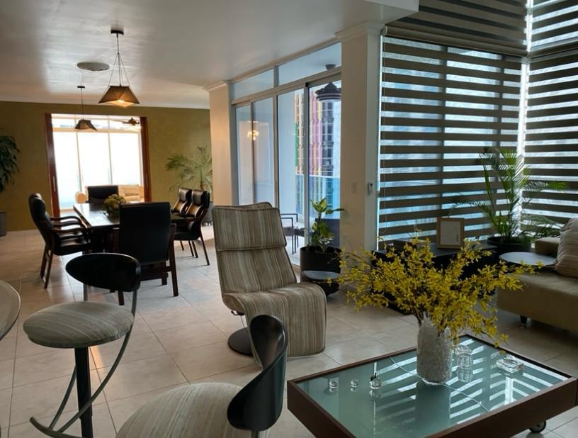 Sala amplia con muebles, persianas piso-techo, A/A inverter, bar con 6 sillas.