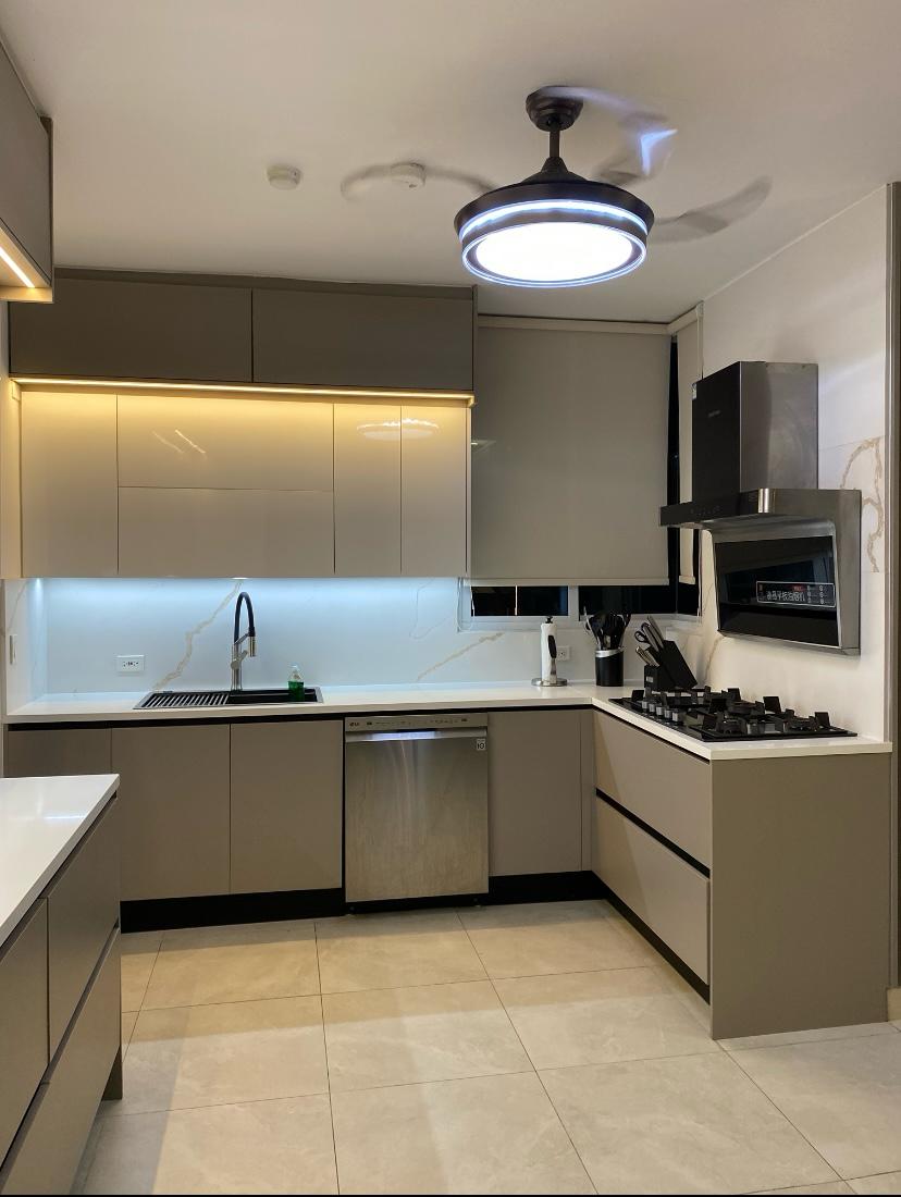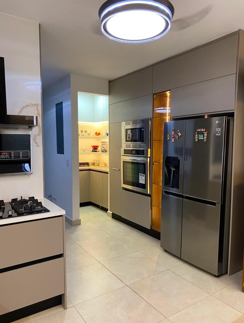 Cocina integral equipada: horno, estufa, extractor, microondas, nevera, alacena y despensa iluminada.